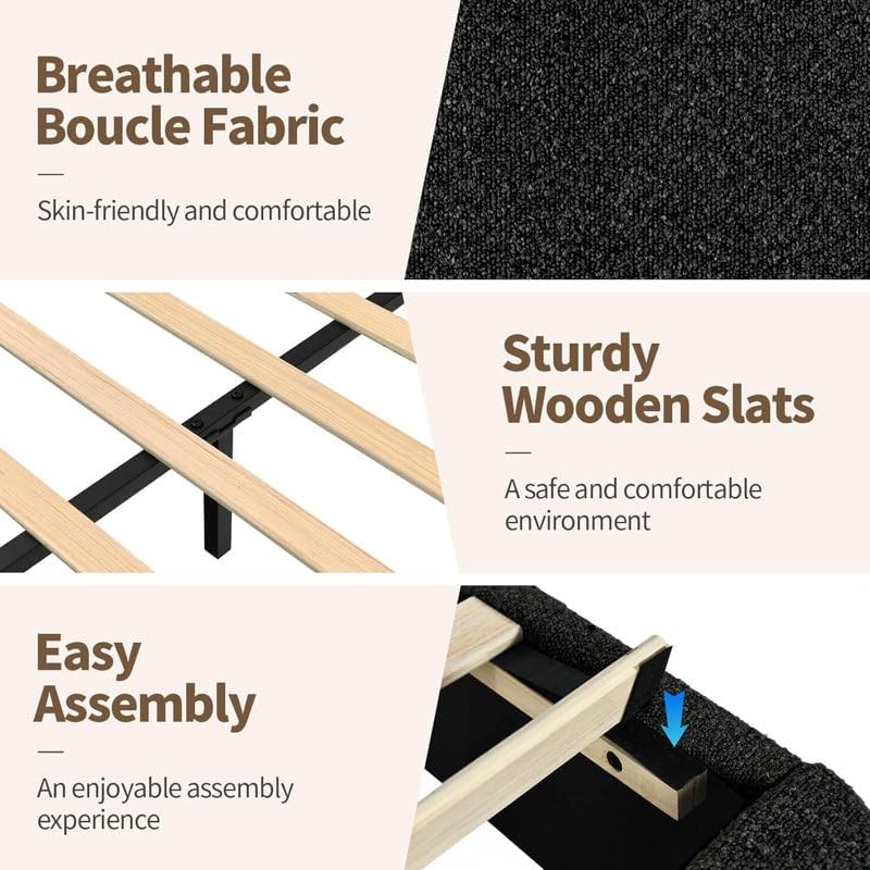 Introduce the LUXURY LUXE Bensu Boucle Upholstered Platform Bed, the epitome of modern elegance and cloud-like comfort. This queen-size bed features a sumptuous, creamy boucle fabric upholstery that adds a warm, textured, and calming presence to any bedroom. The gracefully rounded curved headboard and footboard design provide a gentle, organic silhouette, offering a perfect backrest for reading or watching TV. Crafted with a sturdy solid and manufactured wood frame, reinforced with 12 wooden slats and center support legs, it ensures exceptional durability and a weight capacity of 800 lbs—all without the need for a box spring. With a convenient low-profile design and 2.3’’ (5.8 cm) underbed clearance, this bed frame combines sleek style with practical assembly, taking only 30-45 minutes for two people with all tools included.